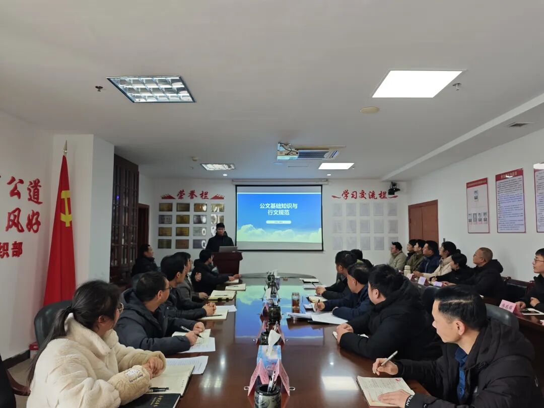 課堂上,徐浩忠同志以《公文基礎知識與行文規范》為主題,結合《黨政機關公文處理工作條例》與《黨政機關公文格式》國家標準,通過PPT展示、案例分析與實操要點梳理,對公文種類、格式、行文規則及擬制等核心內容進行系統講解,并對常見典型錯誤展開剖析。課程內容詳實、重點突出,具有較強的實用性和操作性,為干部日常公文處理工作提供了清晰指引。